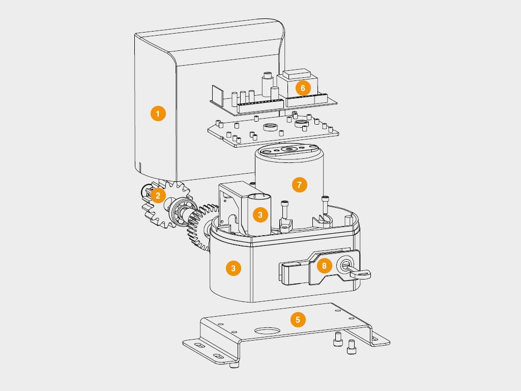 Верхнюю часть корпуса изготавливают из ударопрочного ABS-пластика, а нижнюю – из алюминиевого сплава, затем окрашивают порошковым методом. Благодаря классу защиты IP54 привод устойчив к воздействию влаги, грязи и пыли.